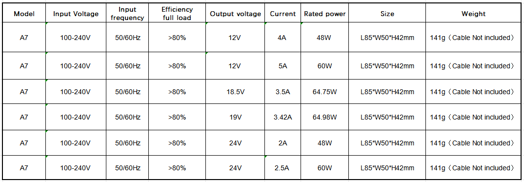 Input characteristics: The A7 power adapter  is designed for countries all over the world , so it support the Width-Voltage with 100V-240V requirment , meanwhile in order to Adapt to voltage fluctuations,it eventually support the voltage range with 90-264V so that all over the world countries can use it