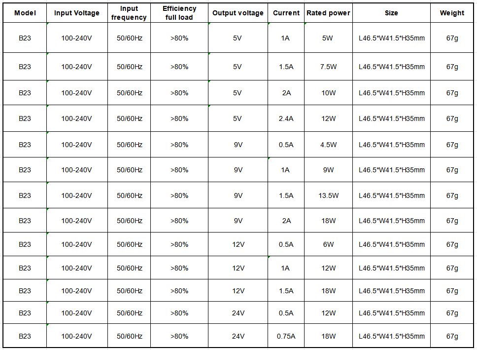 Input characteristics: The B23 USB charger is designed for countries all over the world , so it support the Width-Voltage with 100V-240V requirment , meanwhile in order to Adapt to voltage fluctuations,it eventually support the voltage range with 90-264V so that all over the world countries can use it
