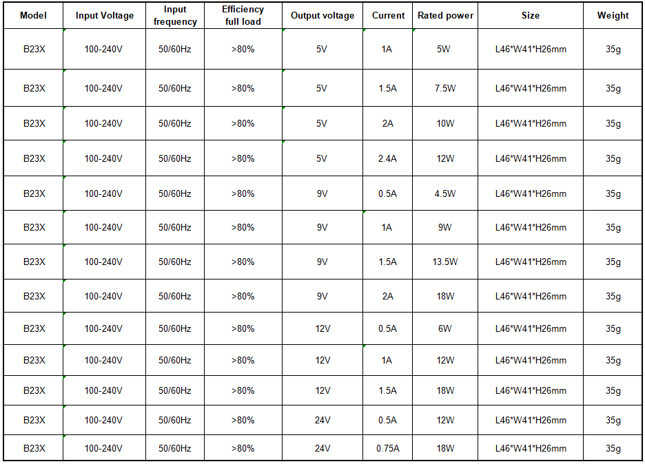 Input characteristics: The B8 power adapter is designed for countries all over the world , so it support the Width-Voltage with 100V-240V requirment , meanwhile in order to Adapt to voltage fluctuations,it eventually support the voltage range with 90-264V so that all over the world countries can use it